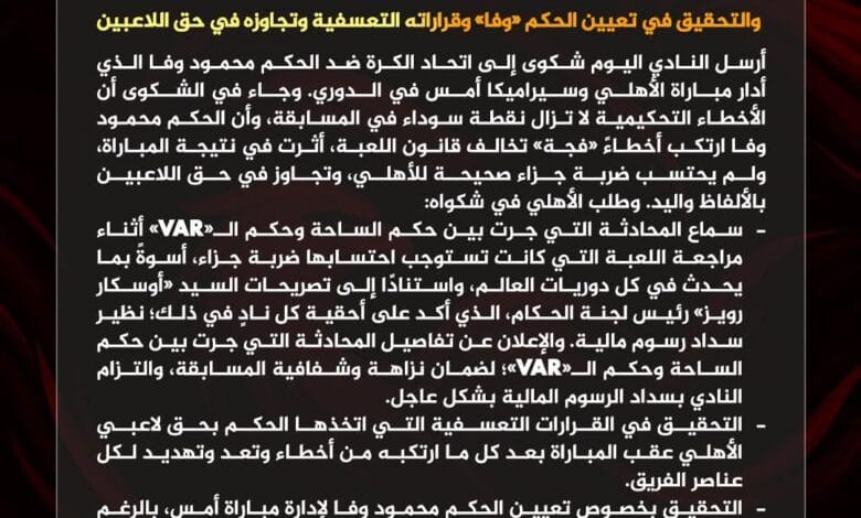 الأهلي يطالب بمراجعة تسجيلات حكام الفيديو ويكشف عن تحقيق في تعيين حكم مباراة وقراراته