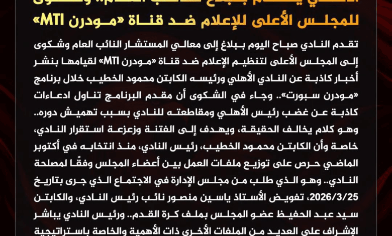 الأهلي يتقدم ببلاغ للنائب العام وشكوى للمجلس الأعلى للإعلام ضد قناة مودرن MTI