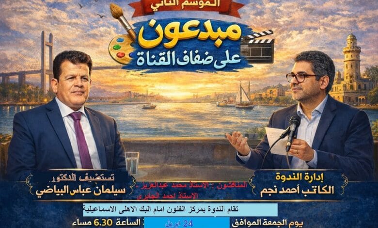 تنظم مبادرة “مبدعون على ضفاف القناة” بالإسماعيلية ندوة لمناقشة كتابي الدكتور سليمان عباس البياضي.