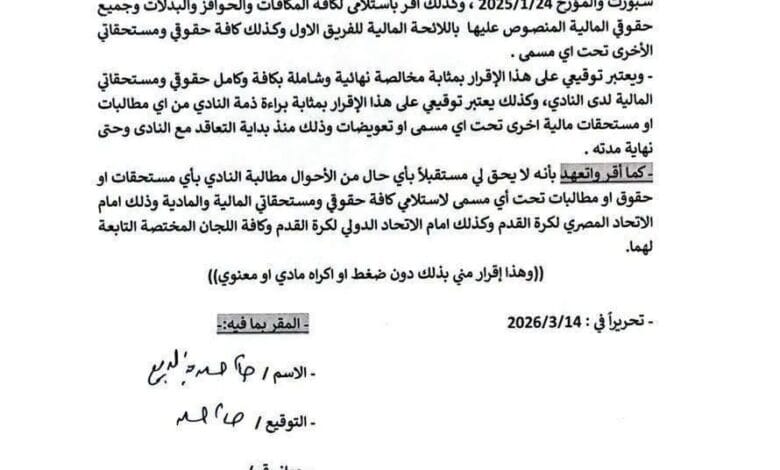 - الوفاء بالالتزامات المالية: يؤكد النادي أنه قد أتم تسوية كافة المستحقات المالية للاعب حسام حسن بتاريخ 14 مارس 2026، وبناءً عليه وقع اللاعب “إقرار مخالصة نهائية وبراءة ذمة شاملة” تسلم بموجبها كافة حقوقه المالية، وأقر فيها بعدم وجود أي مطالبات له لدى النادي.